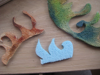 We have had a session in the workshop playing around with vac forming and cutting blue foam with a hot wire. This image below is some shapes I cut out and experiemented with paint to make them look like seaweed. I am considering creating a seaweed headress and this would be easy to shape and light to wear but may be too light in the harsh winds by the coast so would need some sort of strap to hold it on.